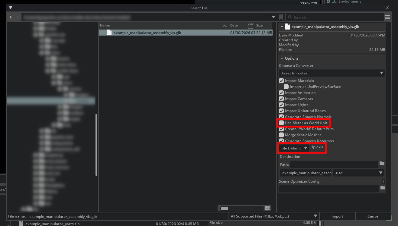 • If you take a look at the file's directory, you'll see a new .usd format file with the same name. Click File -> Open and open the .usd file. You'll be then able to see the full robot model.