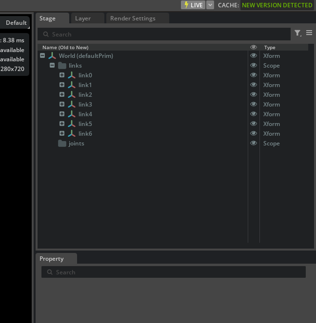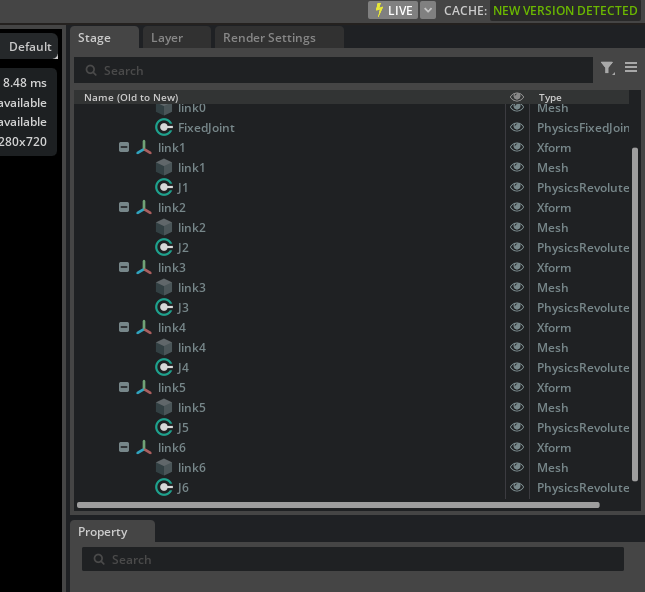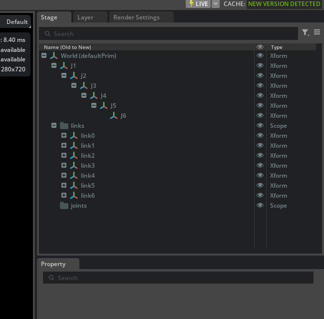 • Open up all the joint prims and you'll see the full stage tree. Right-click on the empty part of the stage and click Create -> Scope. This will create scope for organizing the stage. Create two scopes and name them links and joints.