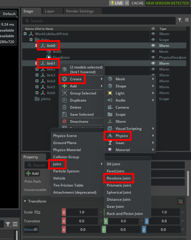 • Next, we will add revolute joint. Select link0 and then ctrl-click link1. Order matters in this part. Selecting link1 then link0 will result in link0 trying to revolute relative to link1 and not vice versa. Right-click on link1 and click Create -> Physics -> Joint -> Revolute Joint. This will create revolute joint under link1.