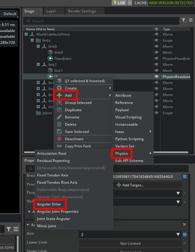 • Rename joint to J1 for consistency. Right-click on J1 and select Add -> Physics -> Angular Drive. We can only control joints with drive property, and joints without them can only move passively.