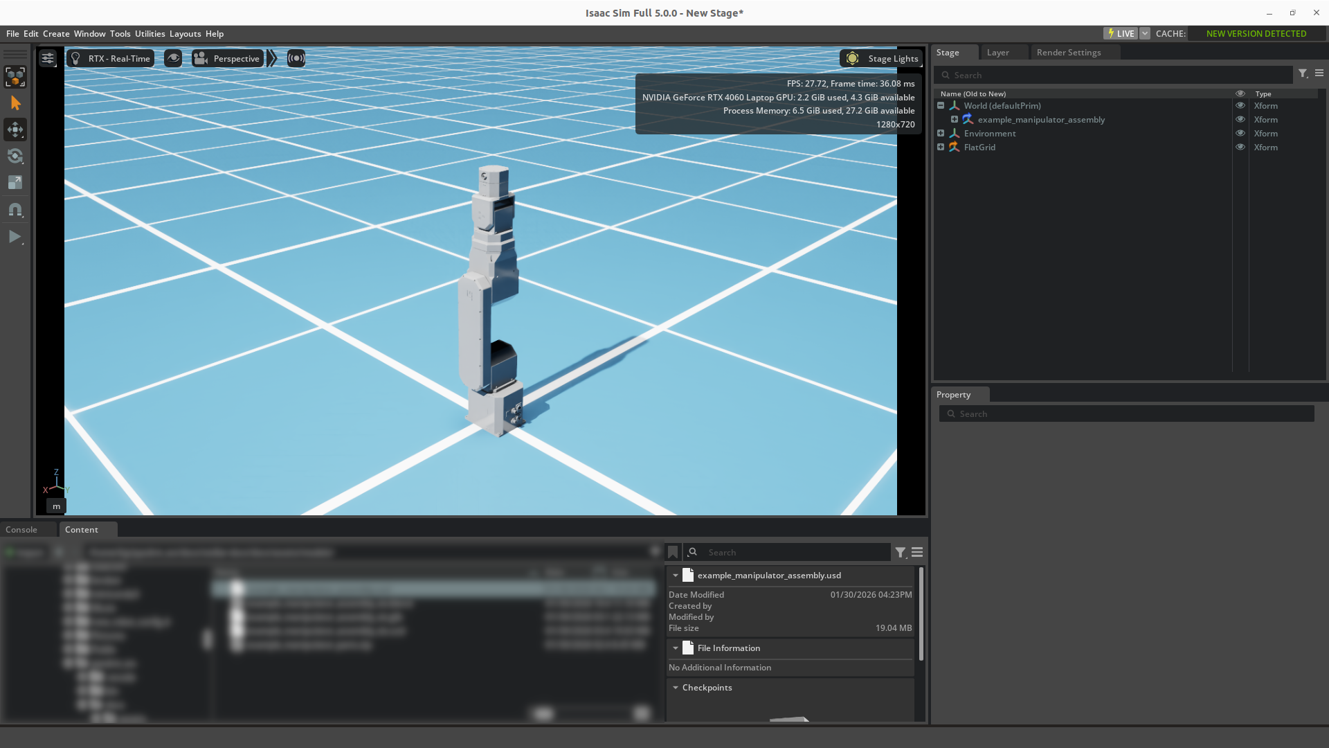 And that's the end of robot preparation. Save and open up new file. Click Create -> Environments -> Flat Grid. Drag the robot model file to Stage on the right, and you'll see the robot in the world!