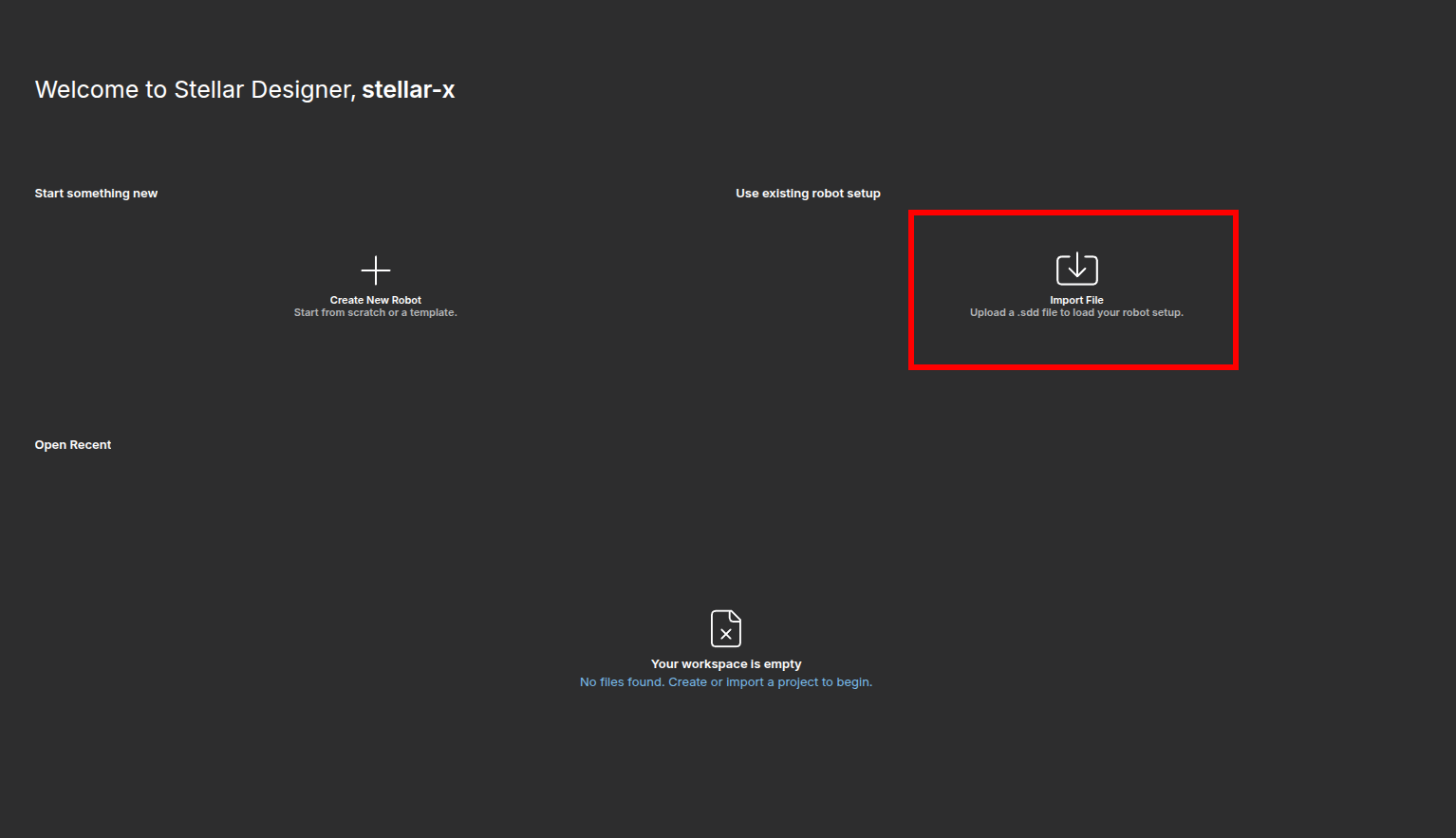 On the main page, click Import File button and load example_robot definition. Double-click to enter the project.