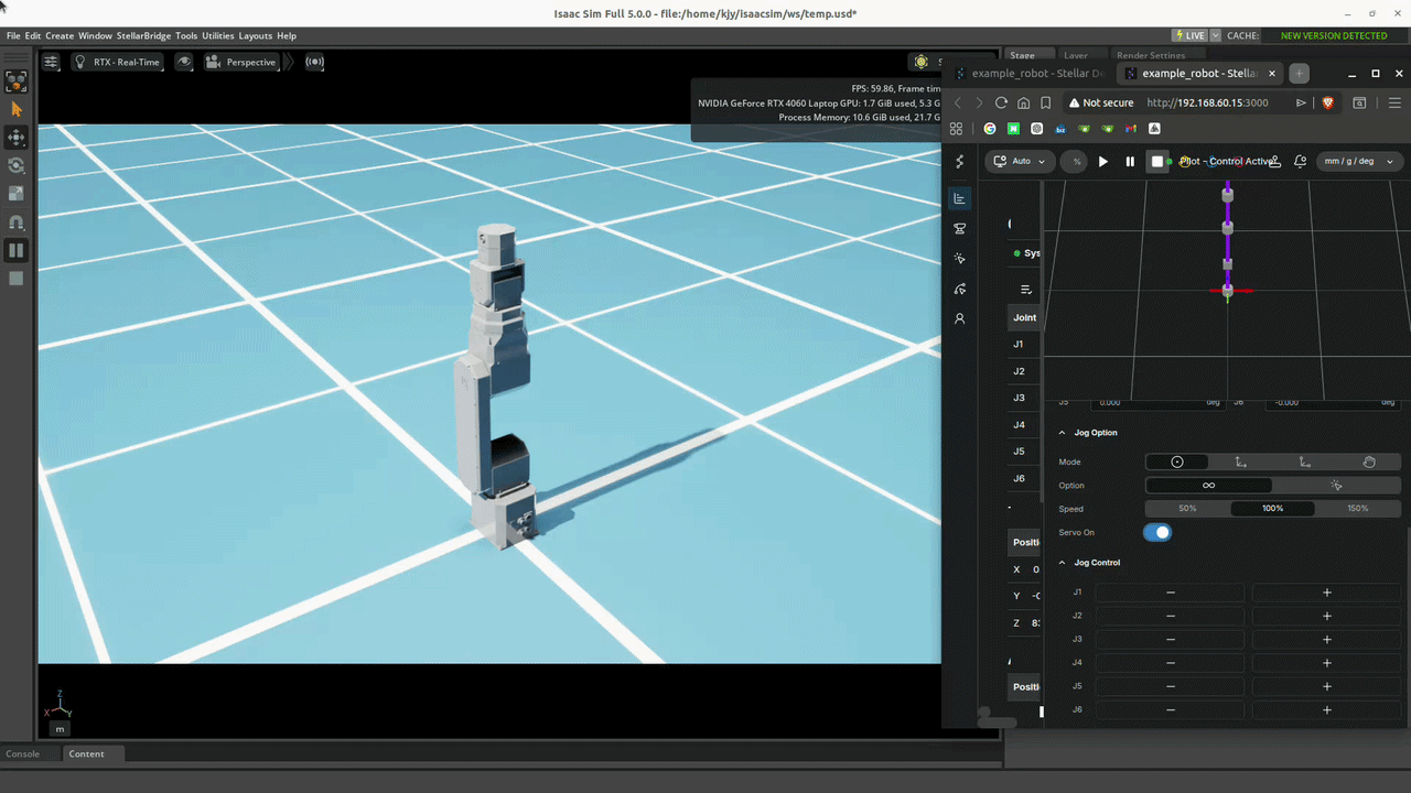 This is Stellar Motion Studio. Open up jog-panel by clicking joystick icon on top-right. Click Servo On. On Isaac Sim, click Play button on the left side. Jog the robot via Jog Control and you'll see the robot is moving accordingly. You can also write your own python script to move the robot at your need.