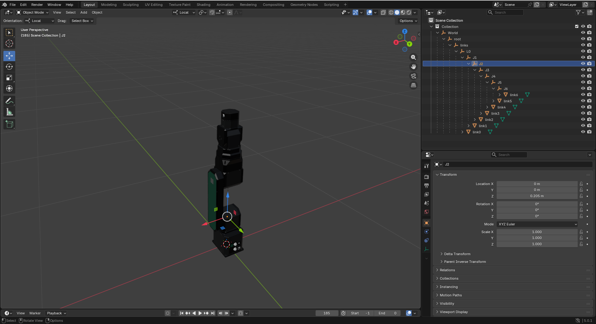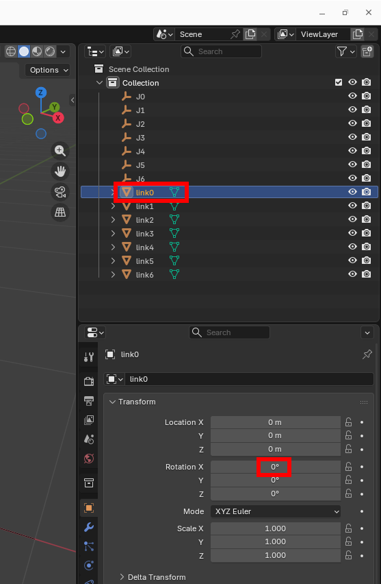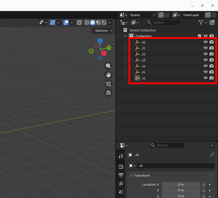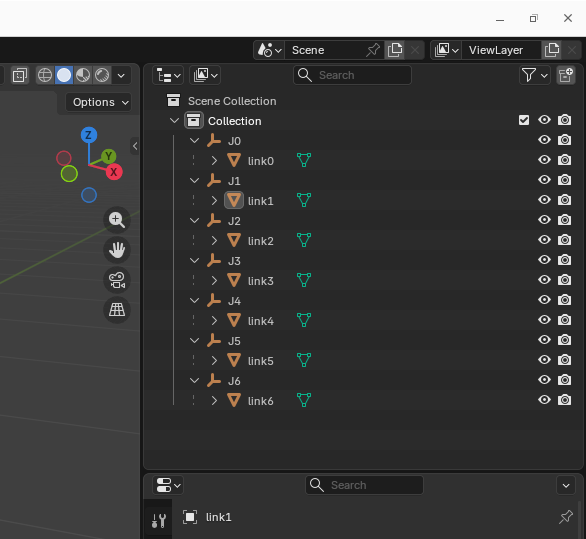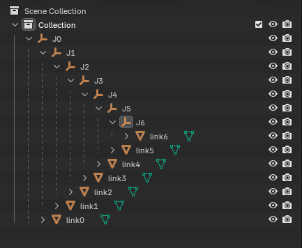 • Select link0 and shift-drag the link to the J0 joint. link0 should now lay under J0. Repeat it for all the other links.