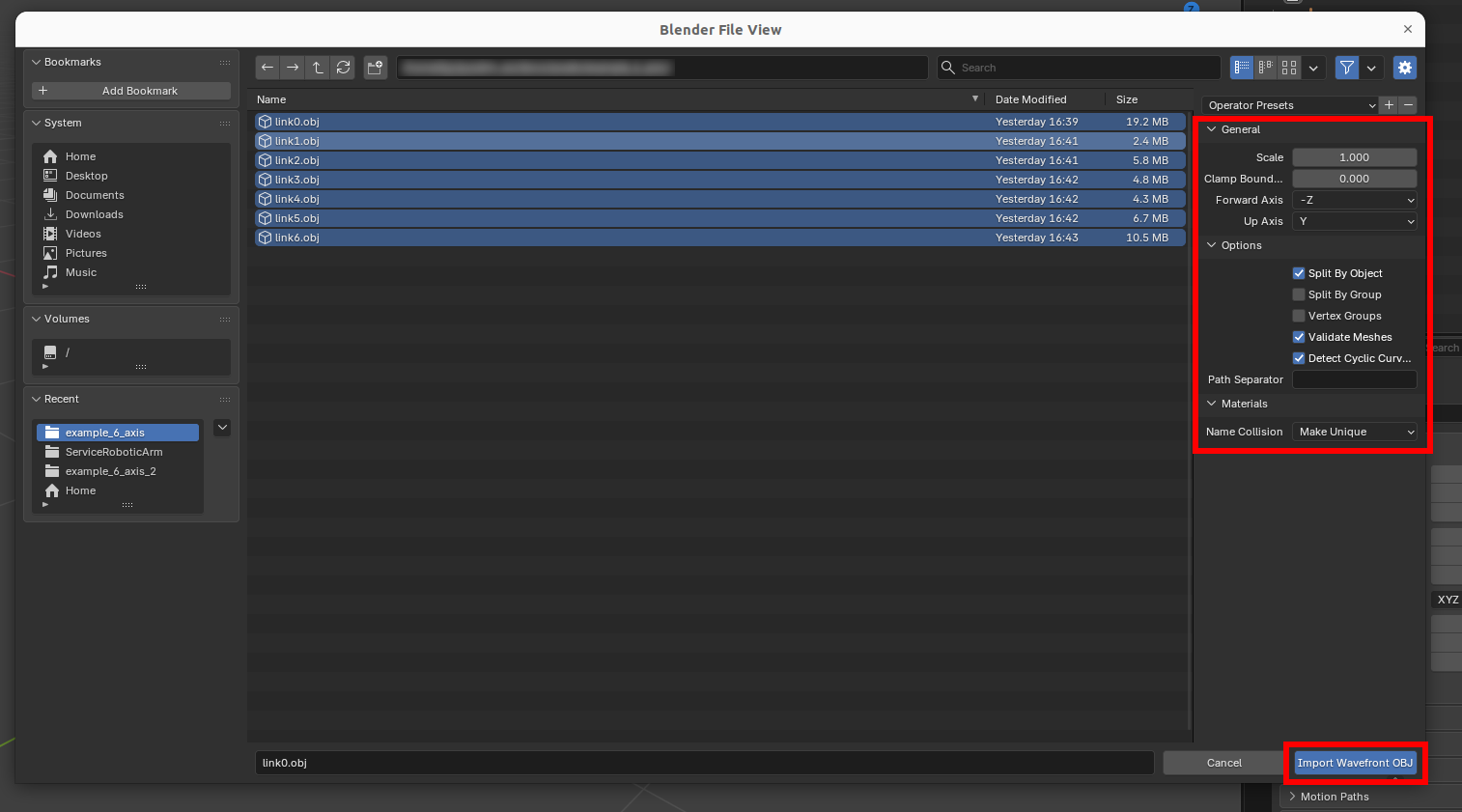 • Now, we are going to add 3d models. Click File -> Import -> Wavefront. Go to saved directory and import all 7 of them. Be aware of import settings. If imported successfully, it should look like bottom picture.