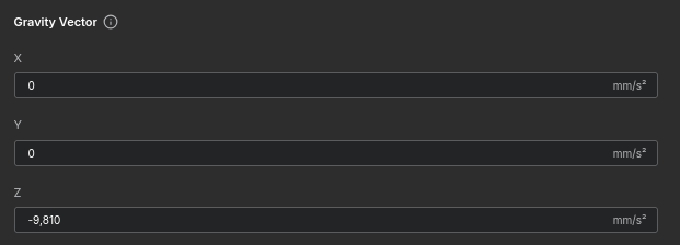 Set the gravitational acceleration relative to the World Coordinate System. In our setup, gravity acts downwards along the negative Z-axis.