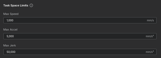 Configure the kinematic limits for the Task Space (TCP motion). Enter the values exactly as shown in the image below: