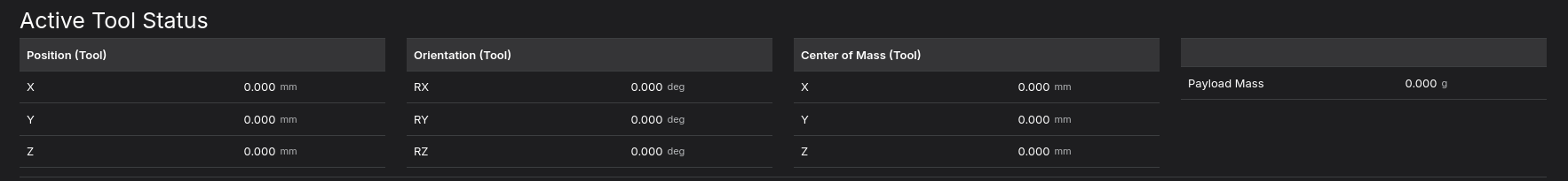 This section displays the status of the currently equipped tool. Since no tool is currently mounted, you can see that the values for Position (Tool), Orientation (Tool), Center of Mass (Tool), and Payload Mass are all zero.