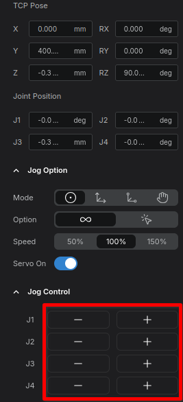 This section displays the current state of the robot's axes. Since this is a 4-axis robot, you will see the status values for joints J1 through J4.