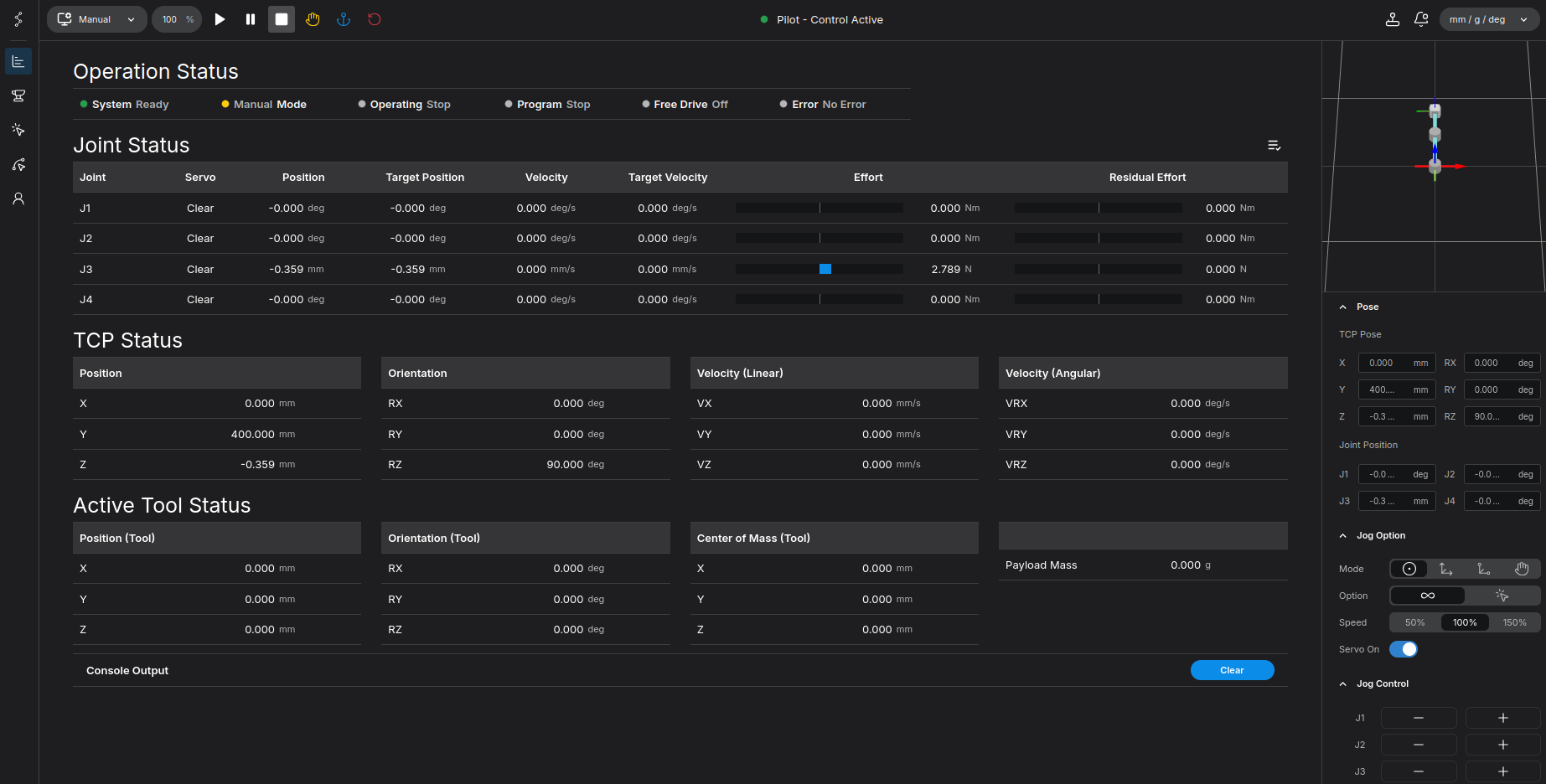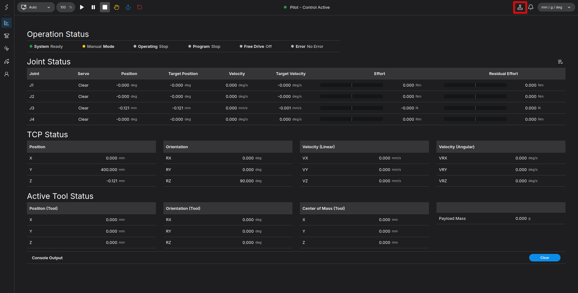 In this tutorial, we will explore the main dashboard of the robot interface and learn how to perform basic manual movements (jogging). By following these steps, you will understand how to monitor the robot's current state and safely operate its joints.