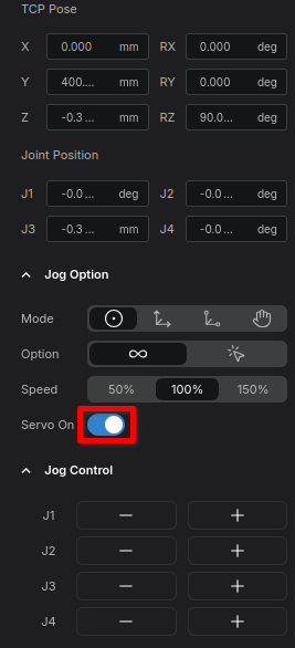 - Click the Servo On button. You will see an indication that the servos are now active and ready for commands.
