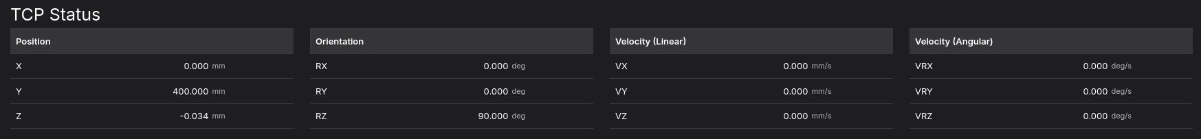 This panel shows the pose (position and orientation) of the robot's end effector.