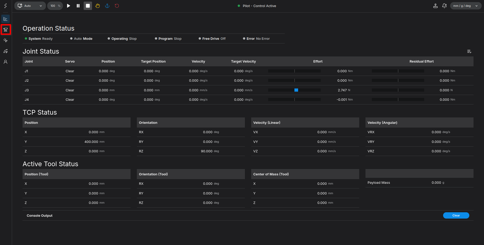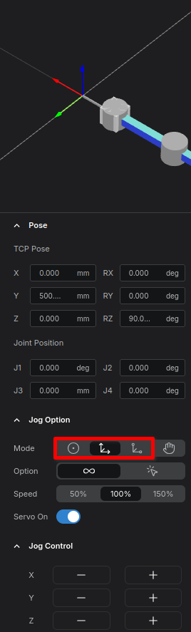 - Observe the robot's coordinates. You will notice the Z-axis in the Pose section, or Joint 3, slowly rising.