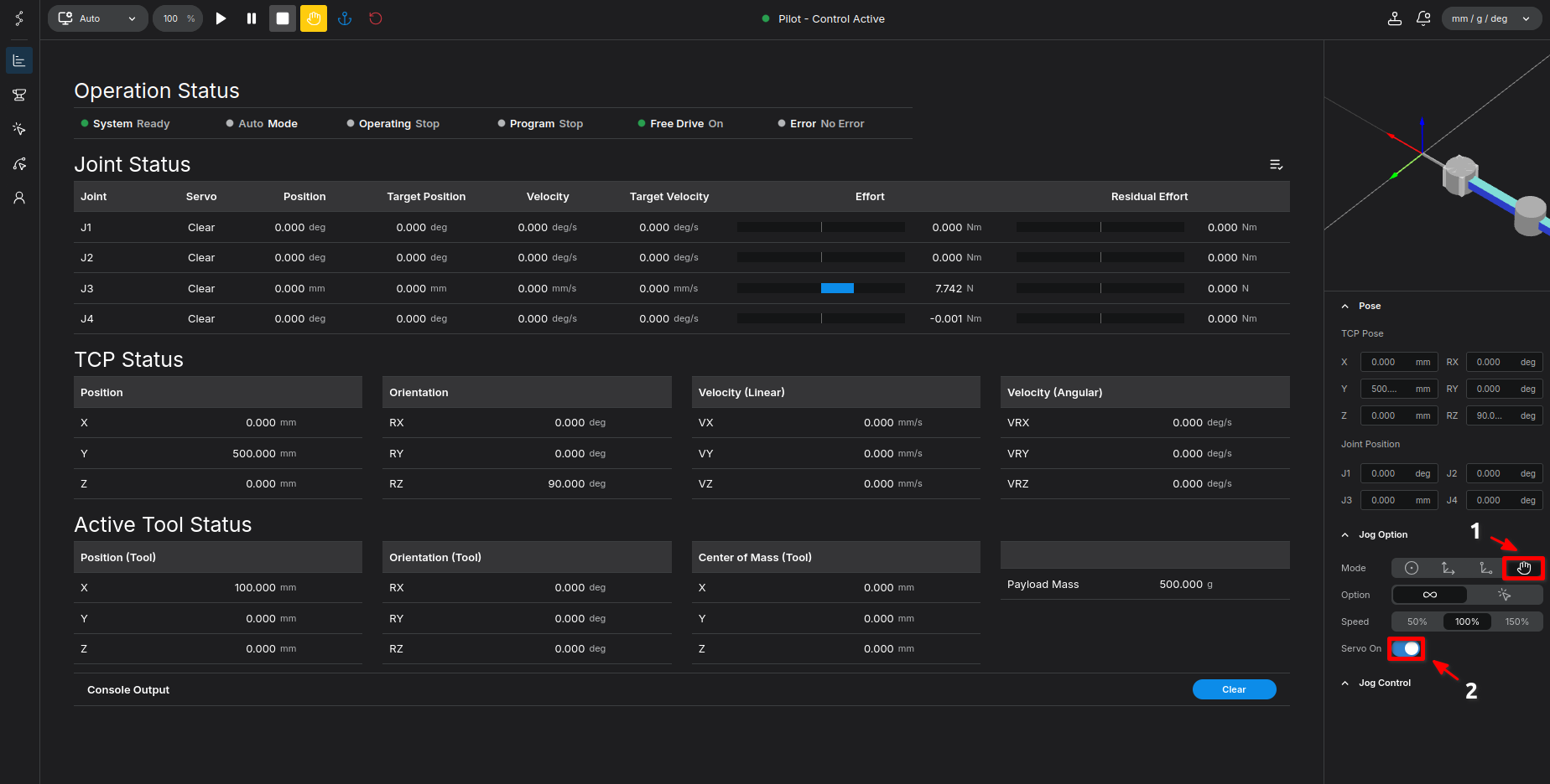 - Go to the right Jog tab, click Free Drive, and turn Servo On.