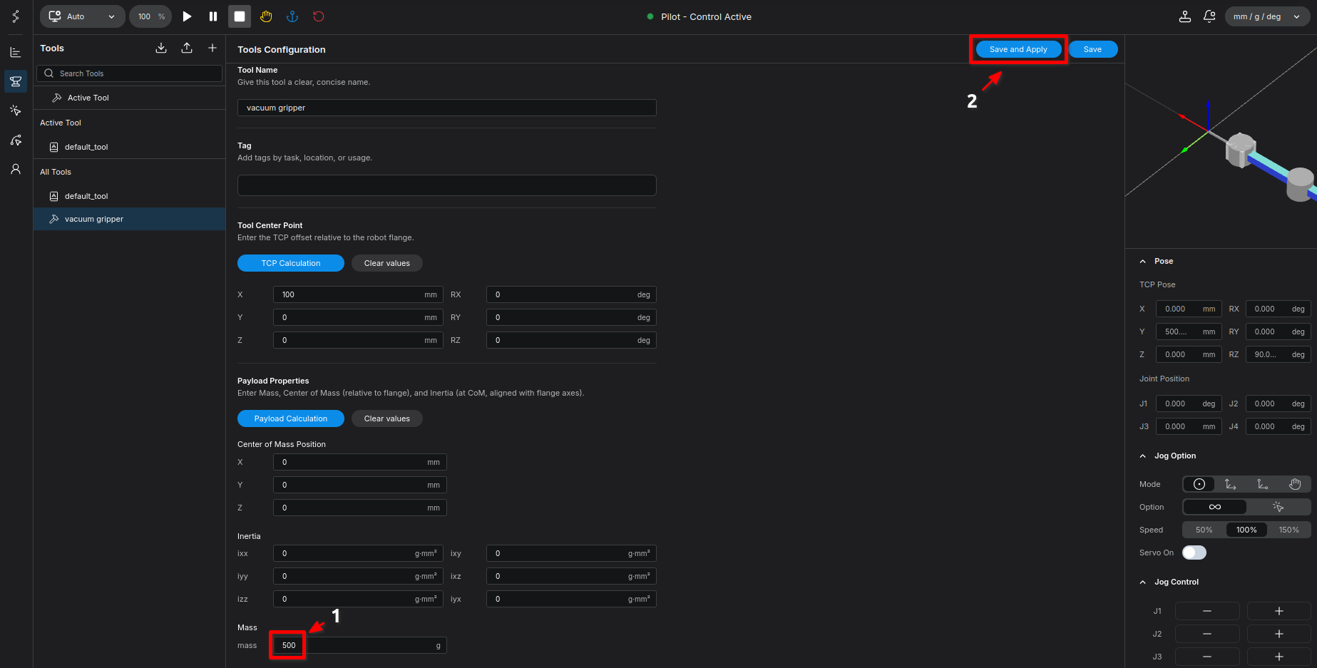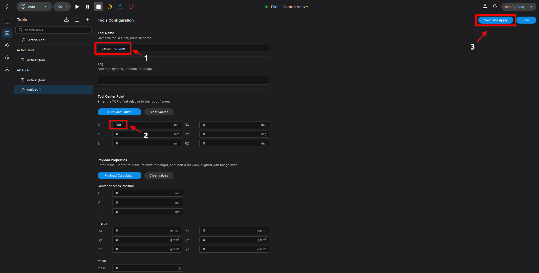 Goal: Create a tool named vacuum gripper, configure a 100mm TCP offset, and set a 500g payload.