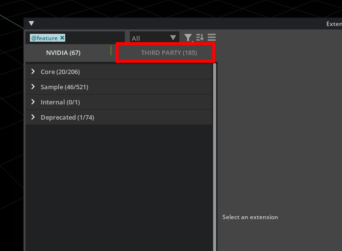 3. On the extensions window, click the THIRD PARTY button. Delete default feature, and search for stellar.