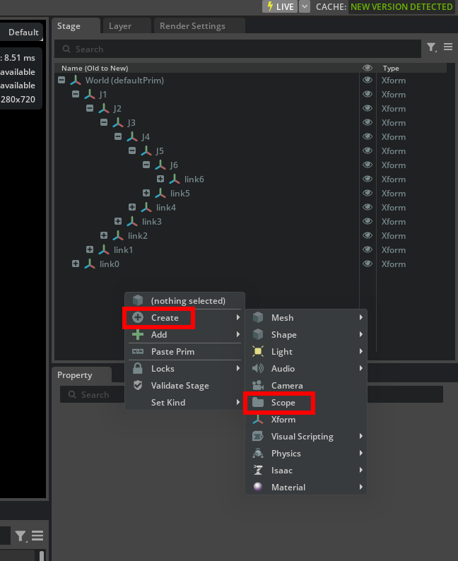 Create->Scope. This will create scope for organizing the stage. Create two scopes and name themlinksandjoints.