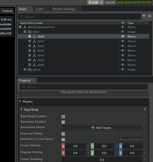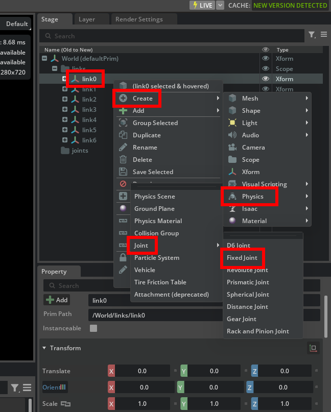 link0and right-click. ClickCreate->Physics->Joint->Fixed Joint. This will createFixedJointunderlink0. This joint is like an anchor that fixes base link of the robot to the world. You can see this by looking at the Body settings ofFixedJoint. Empty Body 0 means it is fixed to world. You can explicitly set this To/Worldprim.