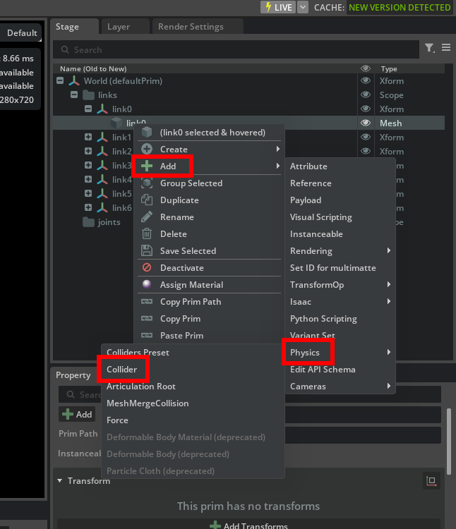 Add->Physics->Collider. This will add collider to mesh and you can also verify it by scrolling down. Default collider type istrimesh, but since the parent prim is rigid-body, it is automatically set toConvex Hull. Repeat this for all the other link meshes.