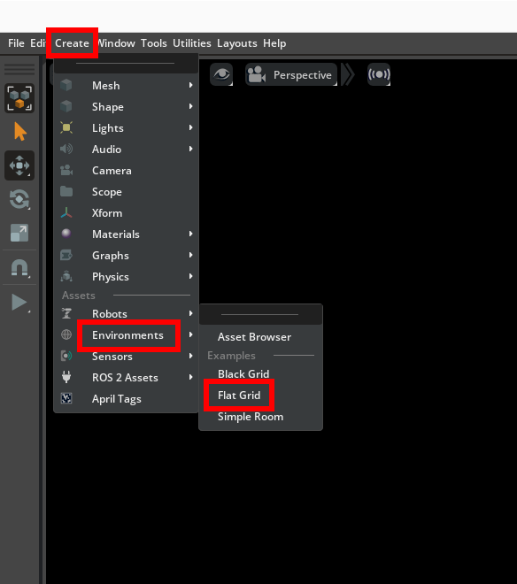 And that's the end of robot preparation. Save and open up new file. Click Create -> Environments -> Flat Grid. Drag the robot model file to Stage on the right, and you'll see the robot in the world!