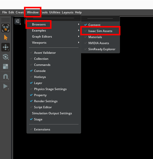 There should be a new tab appeared next to the Content tab. You may have to wait for a while for Isaac Sim to load all the assets. There are plenty of robot models here. But if you need your own robot to be implemented, please follow below general setup guide.