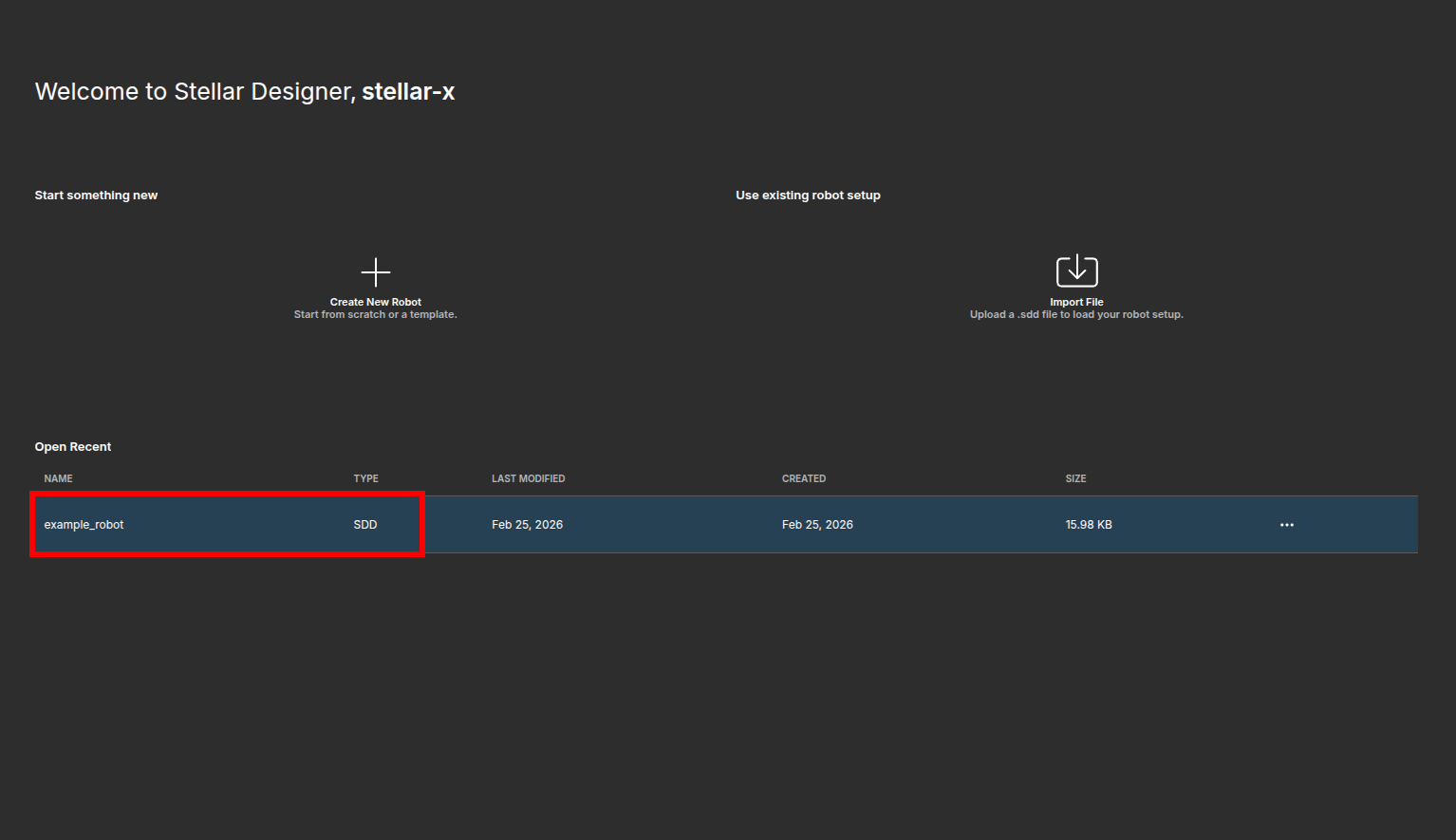 On the main page, click Import File button and load example_robot definition. Double-click to enter the project.