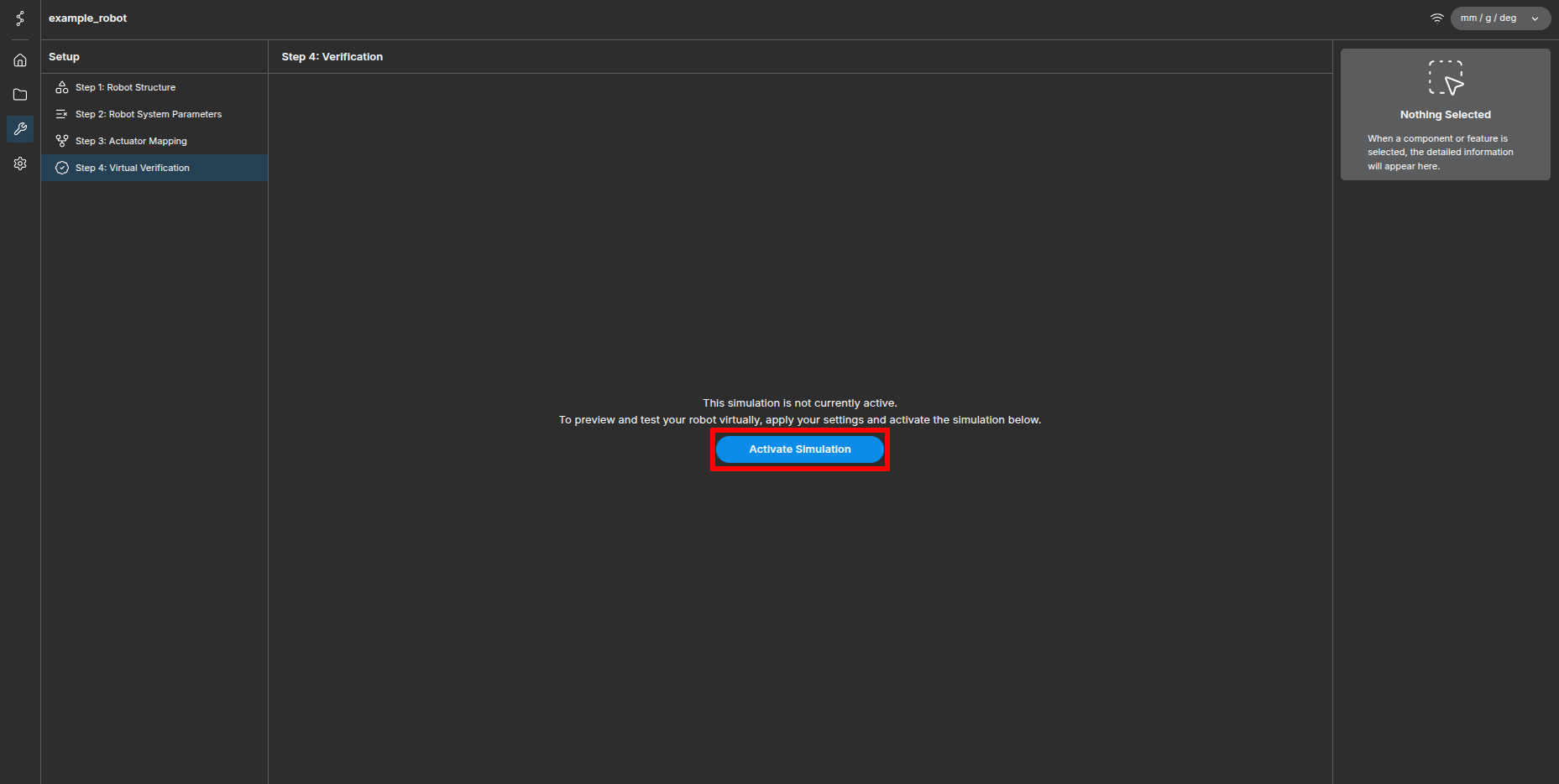 There's nothing for us to configure in this step. Click Step 4: Virtual Verification and click Activate Simulation.