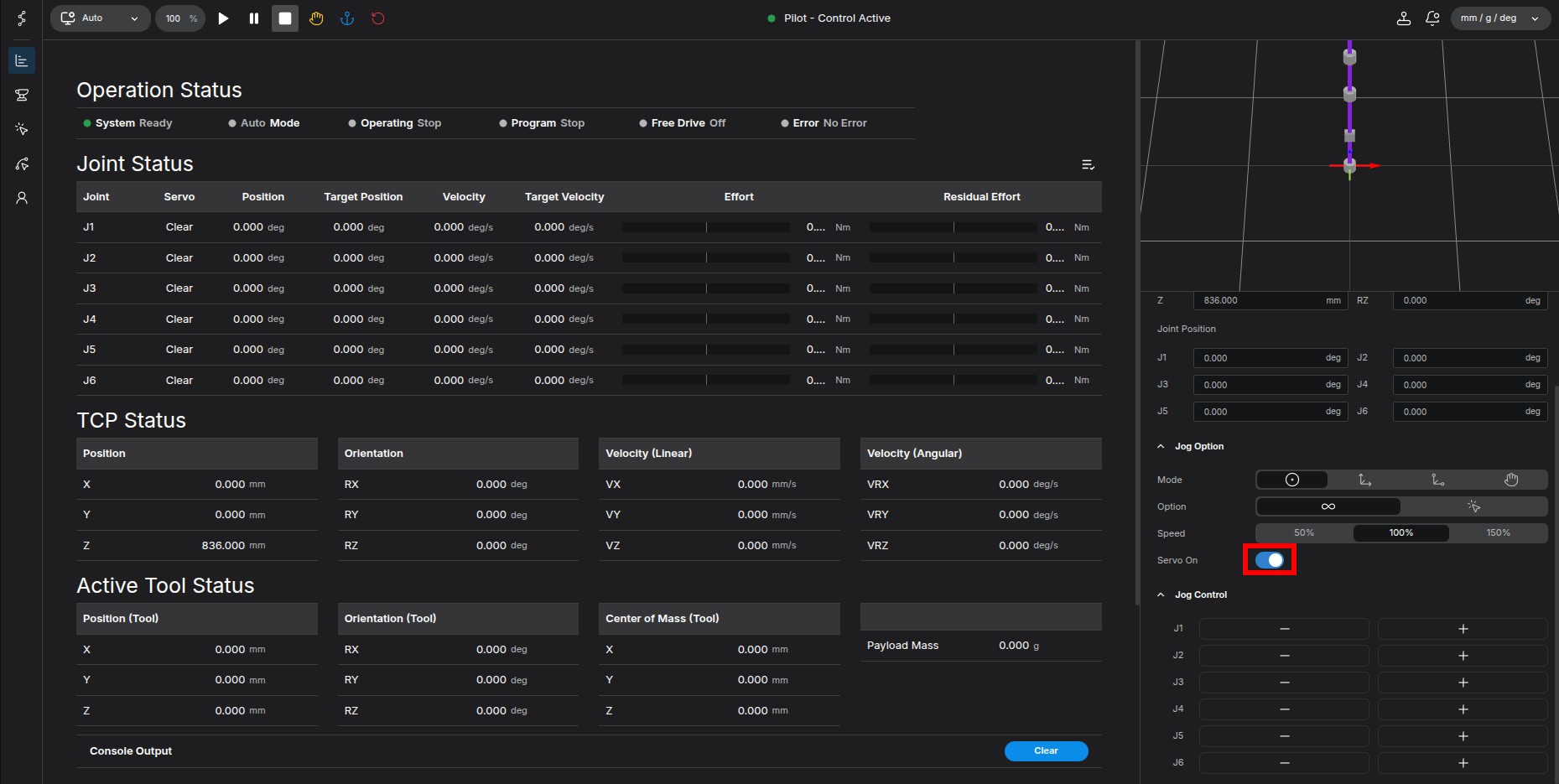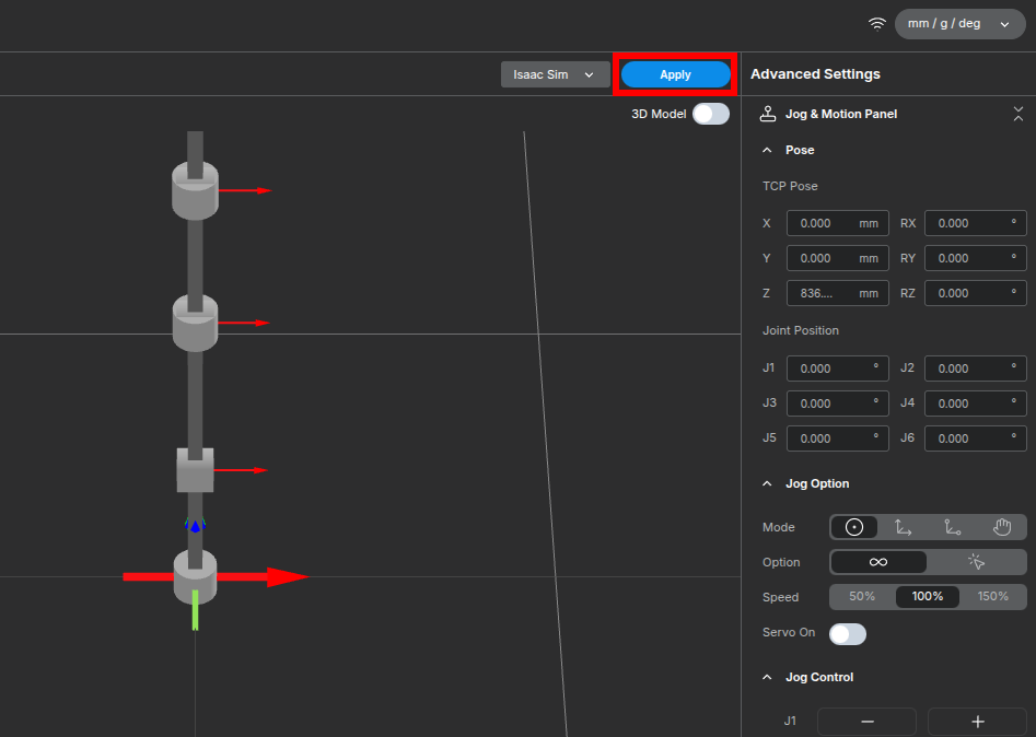 This is Stellar Motion Studio. Open up jog-panel by clicking joystick icon on top-right. Click Servo On. On Isaac Sim, click Play button on the left side. Jog the robot via Jog Control and you'll see the robot is moving accordingly. You can also write your own python script to move the robot at your need.