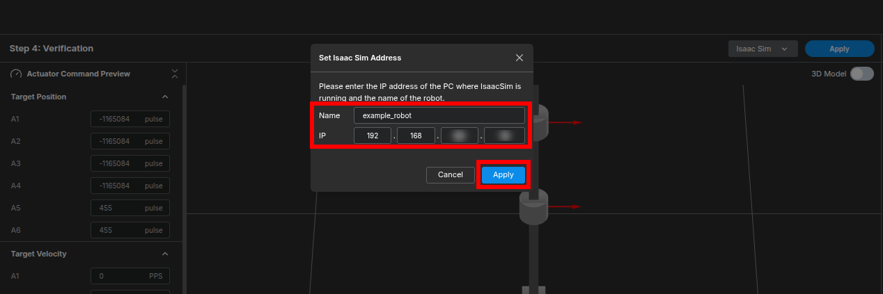 Enter the robot's name in Name, and your PC's IP address in IP. Click Apply and Apply. Finally, click Go to Motion Studio.