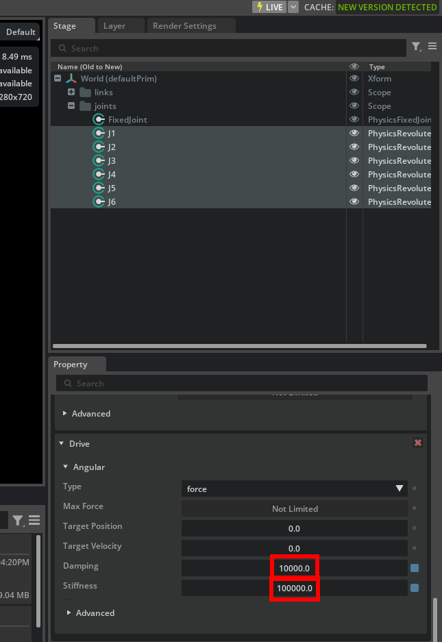 Driveproperty. SetStiffnessandDampingto100000.0and10000.0, resplectively. This is only to set the joints fixed when not using Stellar X. You can choose arbitrary values, only ifStiffnessis higher thanDamping.