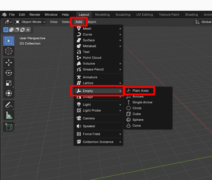 Add->Empty->Plain Axesto add axes. Add total of 7 axes and rename them to J0 ~ J7. These names act as joints in Designer and their name must beJ{number}.