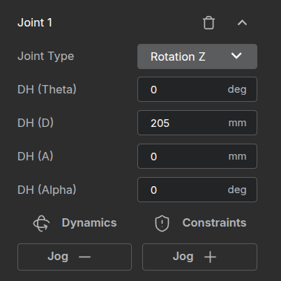 - Shows the DH parameter settings for J1 in Stellar Designer.