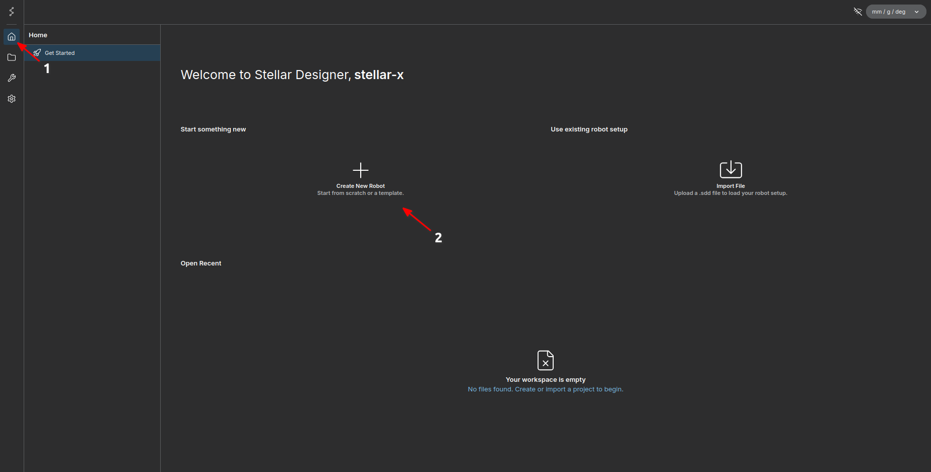 First, navigate to the Home screen and click the Create New Robot button.