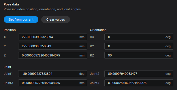 However, in this tutorial, we are intentionally pairing the target pose with its corresponding joint angles. Saving both as a pair will allow us to clearly observe the difference between Joint movement and Linear movement when we write the motion program in the next tutorial.